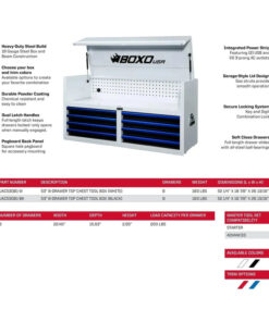 Introducing the ultimate tool storage solution from BoxoUSA: the BoxoUSA 53″ Pro Series Loaded Tool Box Combo. This comprehensive set includes our 53″ 12-drawer bottom tool cabinet, 53″ 8-drawer top tool chest, and the BXE005C-R2, 222-Piece Master Tool Set, offering a total of 20 drawers in a loaded top and bottom tool box combo.